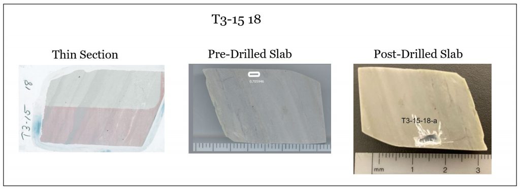Shown below are photos of thin sections, pre-drilled slabs, and post-drilled slabs for each targeted sample. Shown on the thin section photo are the locations of points and line scans designated for laser ablation analysis. Sampling strategy for laser ablation points and line scans is briefly described below. Each trench drilled for this study is labeled with a sample name on the post-drilled slab photos. Most trenches were drilled lengthwise of the slab to obtain an overall bulk carbonate composition of the sample.