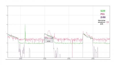 To turn the time-resolved intensities into concentration (ppm), the Iolite software (Univ. Melbourne) was used with 29Si as an internal standard. Calculations for limits of detection within Iolite were based on Longerich et al. (1996). Reduction of data resulted from viewing line scans and excluding data from peaks in analytes indicative of accessory minerals such as phosphorus. Exclusion includes averaging data pre- and post-phosphorous peak. Analyte recovery in NIST-610 averaged within ~3% GeoRem reference values, with the exception of 50Ti. This anomaly is described below. Analyzing the difference in performances of the 49Ti versus 50Ti revealed that there could be an overlap interference from 50Cr or 50V. This interference could explain why the values for recovery on 50Ti (7.57) are significantly higher than that of 49Ti (1.00) as seen in recovery table below. Another possibility of increased Ti50 concentrations could be sourced from interference from Cr in the NIST glass.