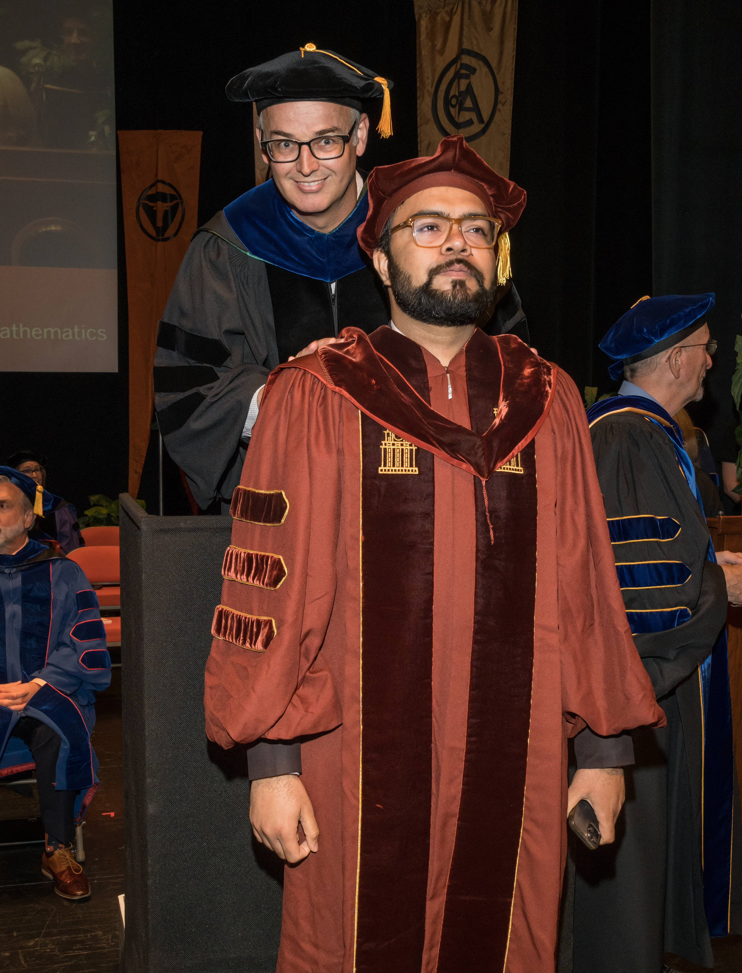 05/09/2025: Afzal graduates with PhD in Computational Science Engineering and MathematicsAfzal returned to UT to participate in the graduation ceremony. Afzal started his PhD in the fall of 2019, working on Modeling Subsurface Flow of Water in Earth and Planetary Sciences. Afzal focused on infiltration processes and cyropheric systems with phase change. His work lead to a new understanding of the formation of ice layers in firn, an important process that stores melt water and prevents it from reaching the ocean. He also developed a model for the evolution of impact melts on icy ocean worlds, such as Europa and Titan. His work shows that these melts are even more likely to drain that previously thought due to porous flow and dilation of the underlying ice shell. |