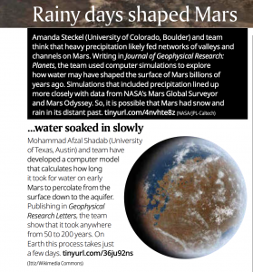 08/01/2025: Afzal and Eric’s paper highlightedThe August issue of Astronomy & Geophysics, the monthly notices of the Royal Astronomical Society, has highlighted the results of Afzal and Eric’s paper in Geophysical Review Letters on Infiltration Dynamics on Early Mars: Geomorphic, Climatic, and Water Storage Implication. It was also featured in the Stars, Cells and God podcast in July. |