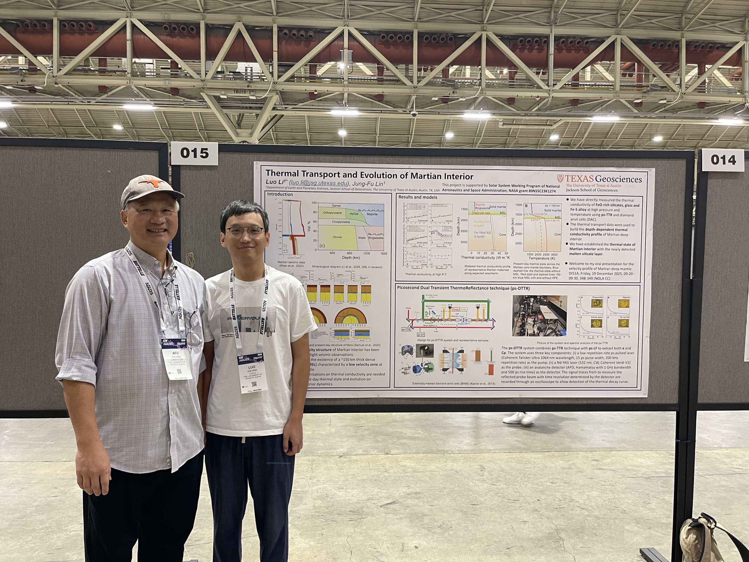 Prof. Lin and Dr. Luo Li attended the meeting. They presented research results on “Thermal Transport and Evolution of Martian Interior” and “Sound Velocities of FeO-bearing Ringwoodite and Majorite: Implication for Martian Mantle Seismic Profiles” at the meeting. Prof. Lin serves as a science advisor to AGU Eos and also the MRP Award Committee. Picture: Poster; Picture: Jazz Music in French Quarter.