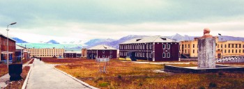 We are in Pyramiden, a former Soviet coal-mining town that was abandoned in 1998. From a junkyard heaped with rusted scrap metal, much of it still covered with Cyrillic writing, we follow a creaking boardwalk past faded 1940s-era apartment buildings and an elementary school with its once-cheery mural of a farmer in traditional Russian dress strolling through a verdant forest. The swings on a half-collapsed jungle gym are still swaying. Beyond the crunch of boots on the ground, the only sound is the cawing of hundreds of seagulls as they coast on the wind above our heads.