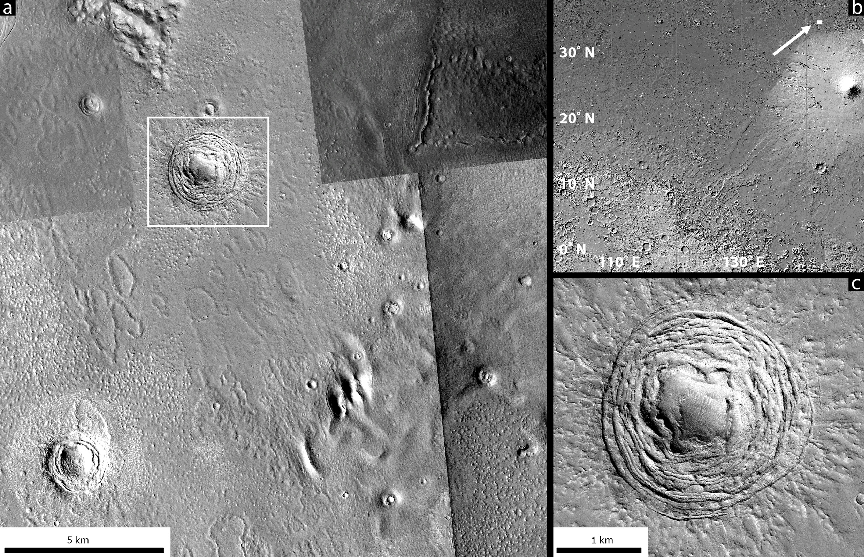A strangely shaped depression on Mars could be a new place to look for signs of life on the Red Planet, according to a University of Texas at Austin-led study. The depression was probably formed by a volcano beneath a glacier and could have been a warm, chemical-rich environment well suited for microbial life.