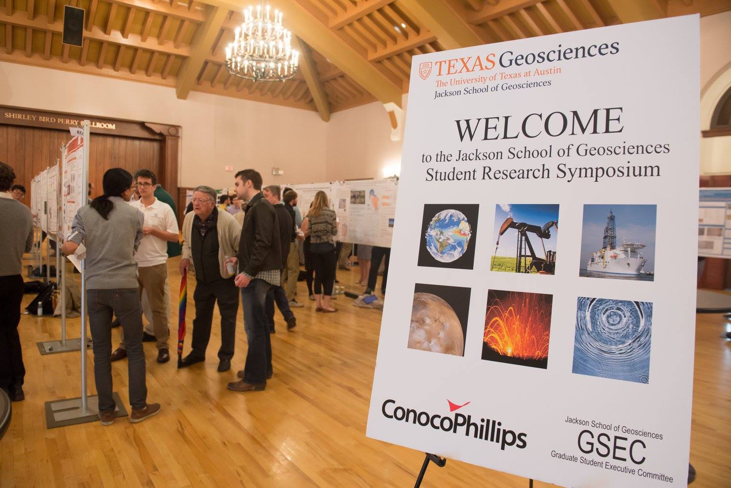 Beneath the glowing chandeliers of The University of Texas at Austin’s Union ballroom, people and ideas mixed among research posters. The sound of presentations and discussions, questions and anecdotes, advice and encouragement, created an amiable buzz that kept up throughout the Jackson School’s Sixth Annual Research Symposium, an event organized by the Graduate Student Executive Committee.