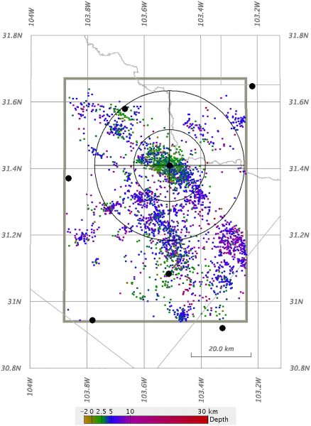 Reference locations for seismic events detected in the Delaware Basin study area (dots colored by depth), Delaware Basin study area (rectangle), county lines (gray lines), and TexNet seismic monitoring stations (black dots).