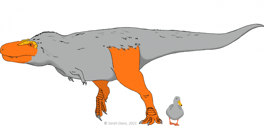 An artist’s interpretation compares areas of bright color on a modern duck to where they might have appeared on an extinct Tyrannosaurs Rex.