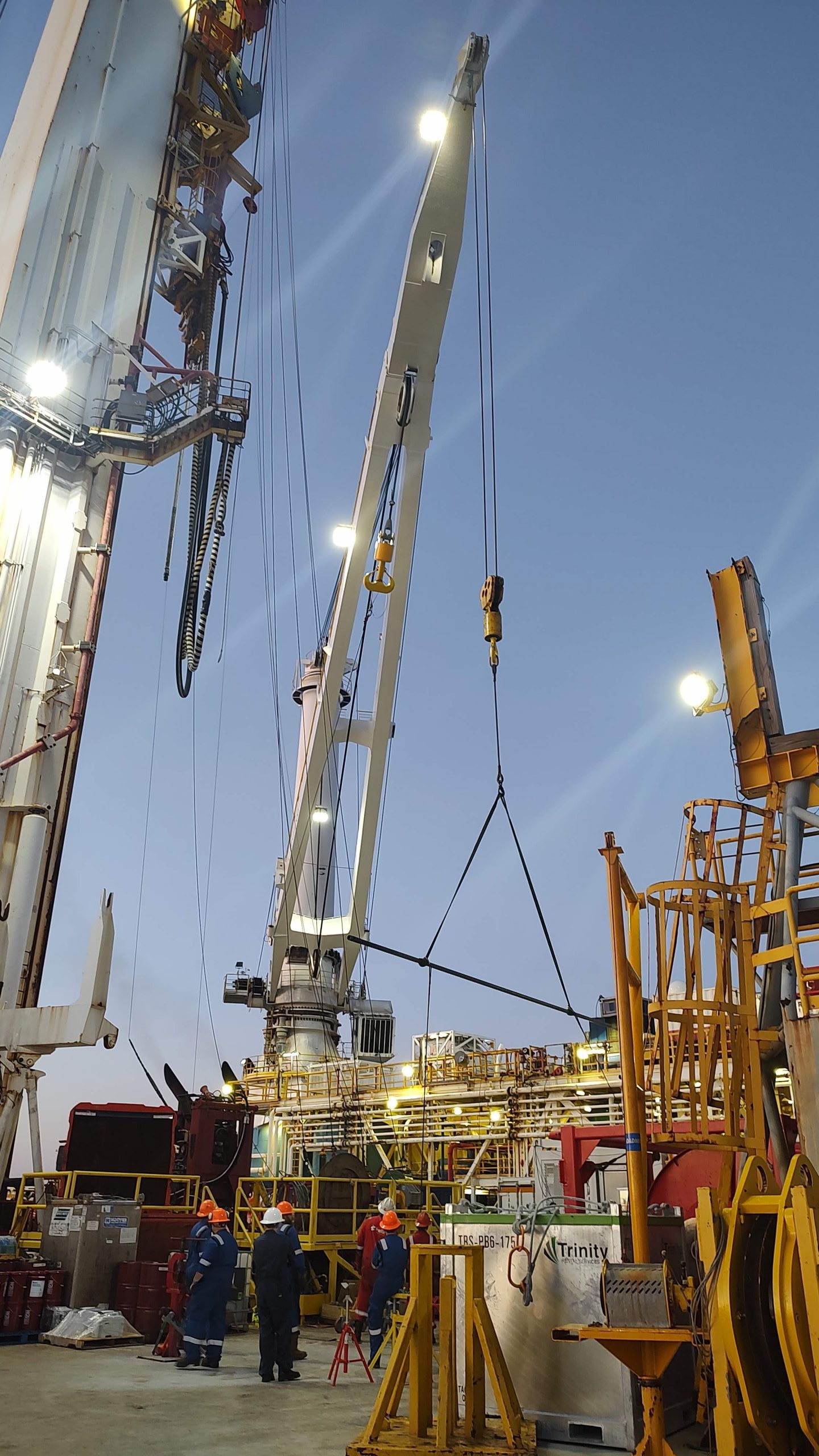 For the scientists aboard, the most satisfying sight of the evening was probably the nine-meter-long drill pipe floating across the night sky as it was moved into position in front of the receiving lab. It was the second core of the mission, something for the midnight science crew to start analyzing.
