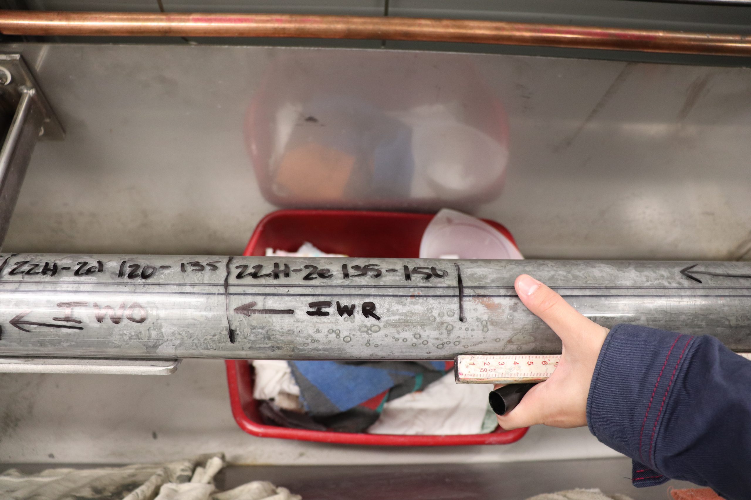 Cook marks the core lining with a permanent marker — flagging voids for sampling and portions to be sent off to the other labs, housed in smaller shipping containers on deck, arranged in what Cook describes as a “jigsaw puzzle trailer park.” But most of the core is left untouched. It will be split and analyzed during the onshore portion of the mission happening in Salt Lake City after the conclusion of the offshore portion of the mission. This second phase of the mission will draw about a dozen additional collaborating scientists from around the world, eager to see what the cores contain and collect samples that could help advance their own methane hydrate research.