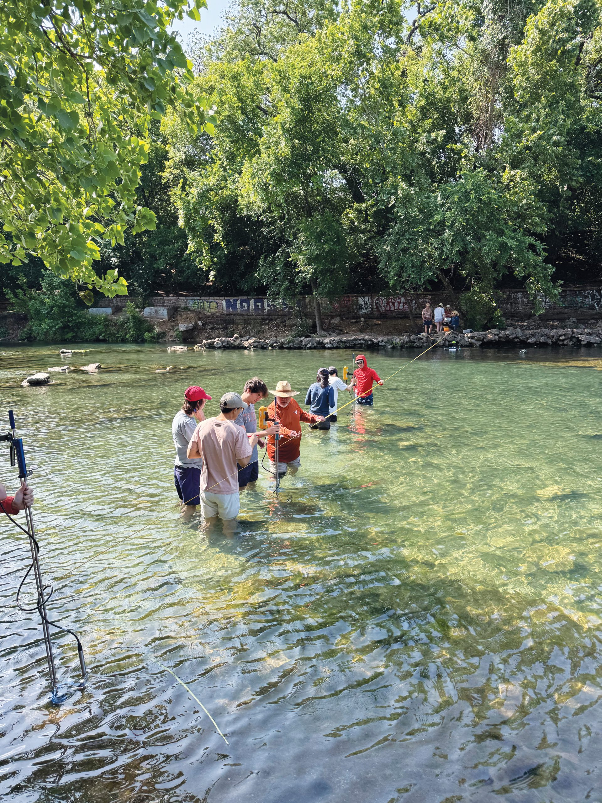 The 2025 Hydrology Field Camp conducted three different studies in Central Texas by collaborating with water agencies in the area. The class worked with the City of Austin to examine urban contamination in groundwater springs, conducted surface water-groundwater interaction studies on the Blanco and Guadalupe rivers with Comal and Hays County groundwater conservations districts, and studied aquifer recharge processes with the Edwards Aquifer Authority. Their work provided useful insight to all of these organizations while teaching the fundamentals of hydrologic science.