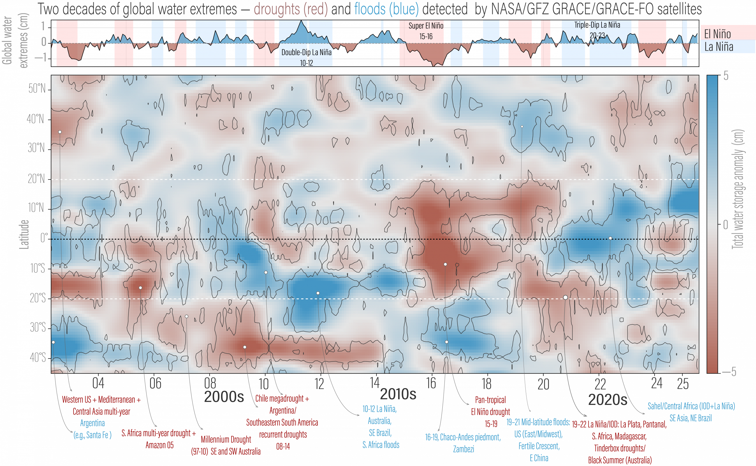 In a recent study published in AGU Advances, the researchers found that over the past two decades ENSO, a climate pattern in the equatorial Pacific Ocean that includes El Niño and La Niña, has been the dominant driver of total water storage extremes at the global level. What’s more, the researchers found that ENSO has a synchronizing effect on water storage extremes across continents.
