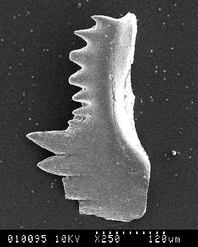 The teeth of a lamprey-like conodont. The image is 250X life size, the scale bar equals 120 microns.