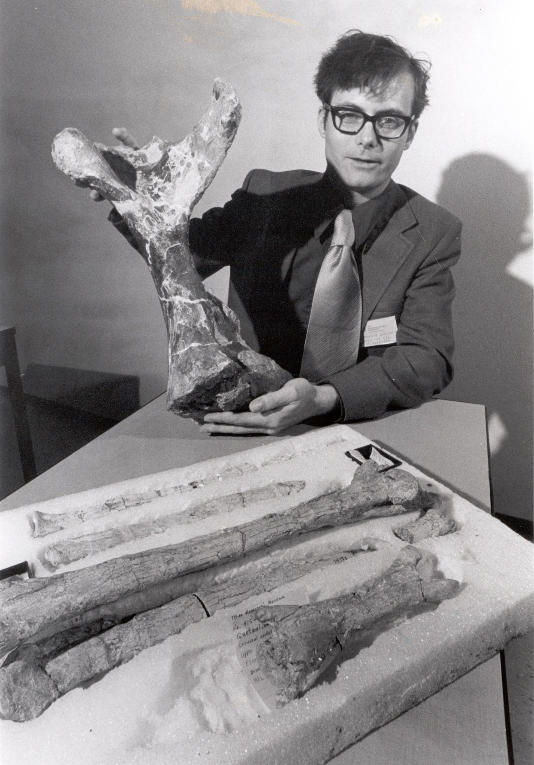 To the left, Dr. Douglas Lawson is pictured holding the humerus of the giant pterosaur Quetzalcoatlus northropi.
