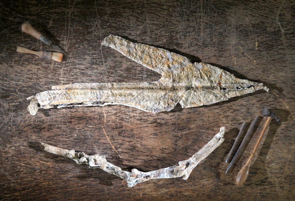 Bottom: The partial skull of Wellnhopterus brevirostris. Preserved are anterior portions of the upper and lower jaws.