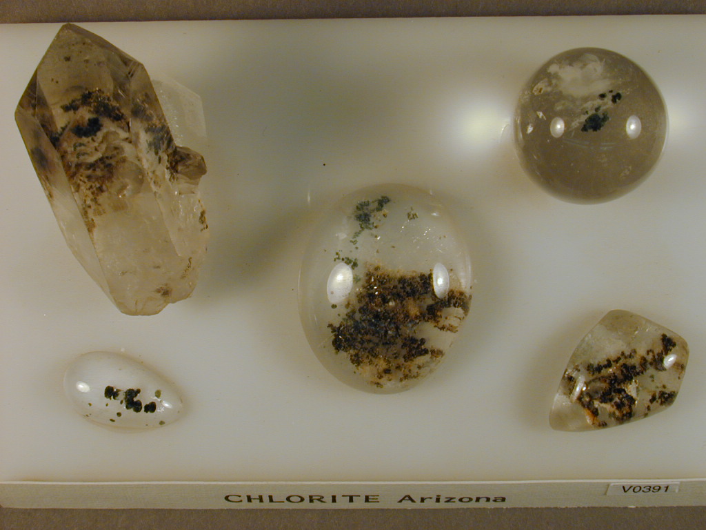 Notes: "Chloriteinclusions in quartz - 5 pieces: subhedral crystal, 2 cabachon, sphere, tumbled"