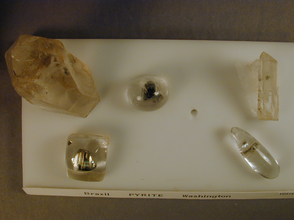 Notes: "Pyrite inclusions in quartz - 5 pieces: 2 subhedral crystals, 2 cabachon, tumbled"